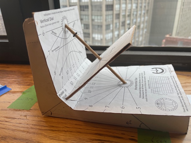 Tony Moss Multidial in window in Chicago, IL. Gnomon set at 42 degrees. Polar dial is parallel to the gnomon and perpendicular to the equatorial dial.