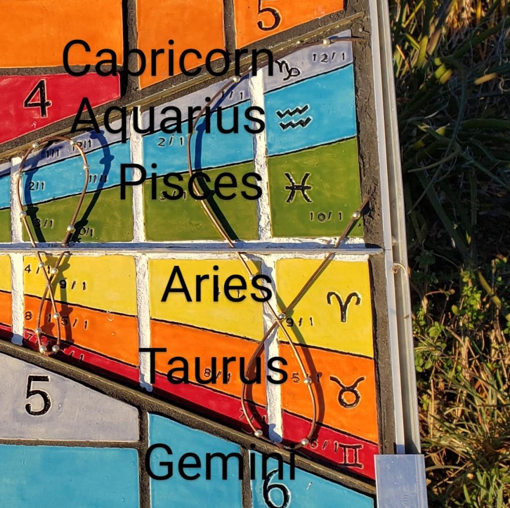In a nod to the Ancients, the Woodland Polar Dial uses the ancient Babylonian Zodiacal dates. The Equinox and Solstice lines are derived from astronomy; the black declination lines of the Zodiac are artificial, but very ancient, markers of passage of time for us humans.