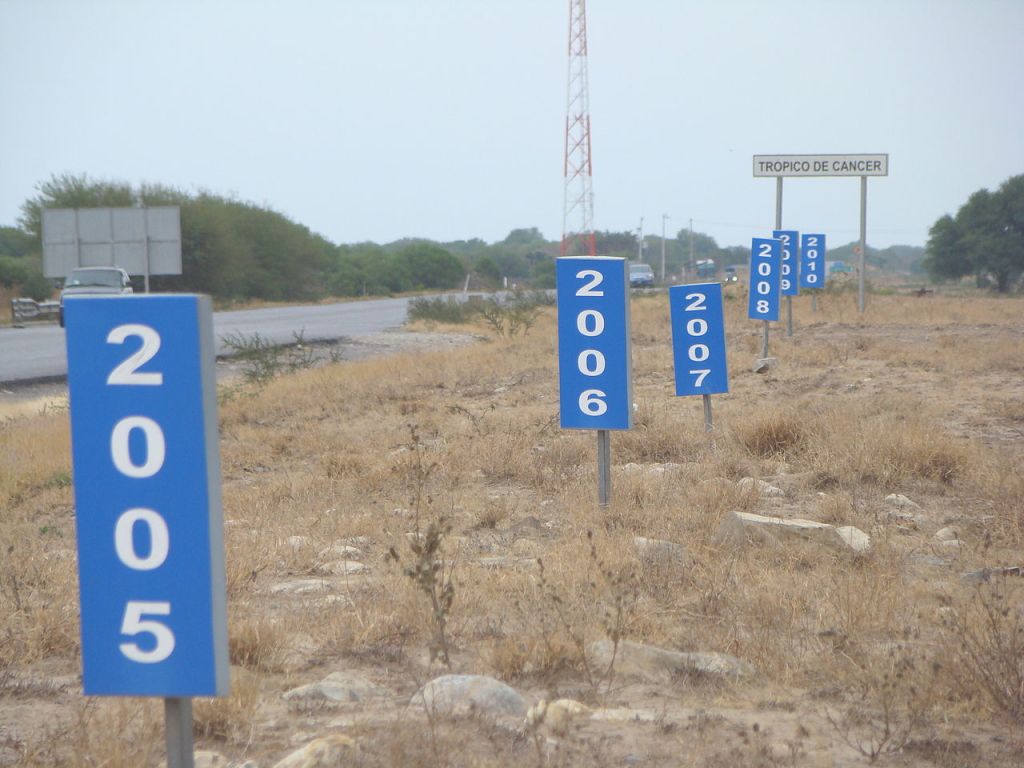 As the earth wobbles, the plane of the equator projected into space – the celestial equator – drifts westward along the ecliptic at a rate of about 50 arc seconds per year. There are 360 degrees in a circle = 360 X 60arcmin/degree = 21,600 arcminutes in a circle = 21,600 arcminutes X 60 arcsecond/arcminute = 1,296,000 arcsecond in a circle divided by 50 arcsecond/year = about 25,920 years to complete a circle. This seems a very small annual change, but can be visualized. The plane of the Tropic of Cancer is parallel to the plane of the equator. Because of the wobble of the axis of earth, the Tropic of Cancer is drifting southward 0.468 arcsecond of latitude a year = 49 feet per year. Carretera 83, a highway in Tamaulipas, Mexico, which crosses the Tropic of Cancer, has markers showing the changing position of the Tropic from 2005 to 2010:
