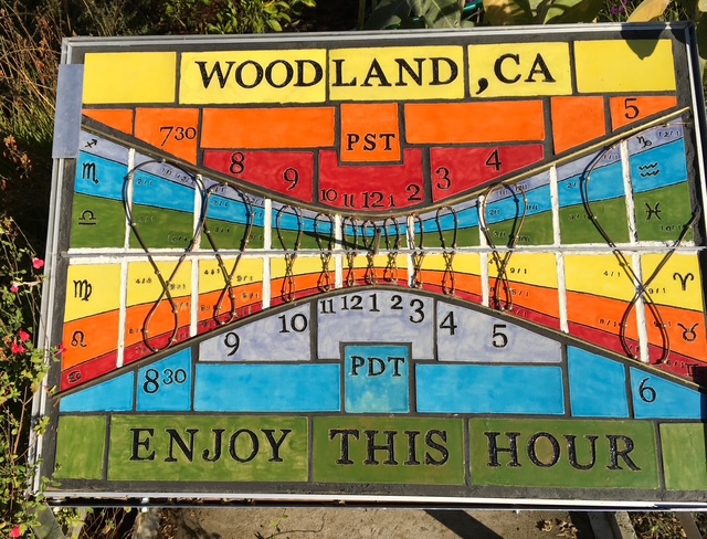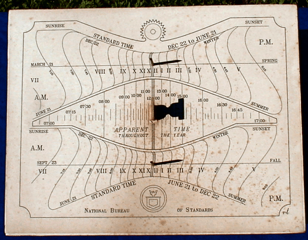 * The dial corrects the local meridian to standard time meridian , 120° W for the Pacific time zone. The dial has been corrected for its 121° 47.4’ longitude by shifting its meridian to the east (1.8° x 4 min/degree = 7.2 minutes).