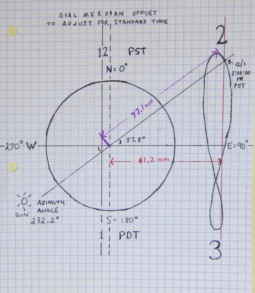 So, the shadow at 2 PM, 12/1, will lie along this line, at an angle 37.8° from the E-W horizontal equinox declination line: