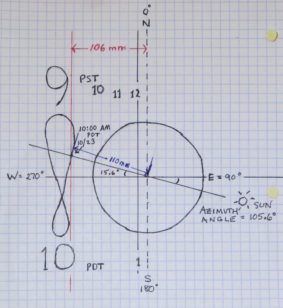 This is a second way to determine the exact location of the shadow tip along the known azimuth angle shadow line, and confirms that the shadow length calculation was correct.