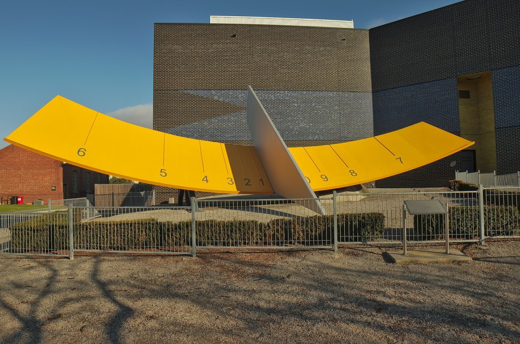 Here is a mammoth polar dial in Melbourne, Australia. Since the plate gnomon is parallel to the earth’s axis, it has vertical hour lines. Since a polar dial casts very long shadows early and late, the dial edges are curved to capture the shadow, which otherwise would stretch into infinity near dawn and dusk: