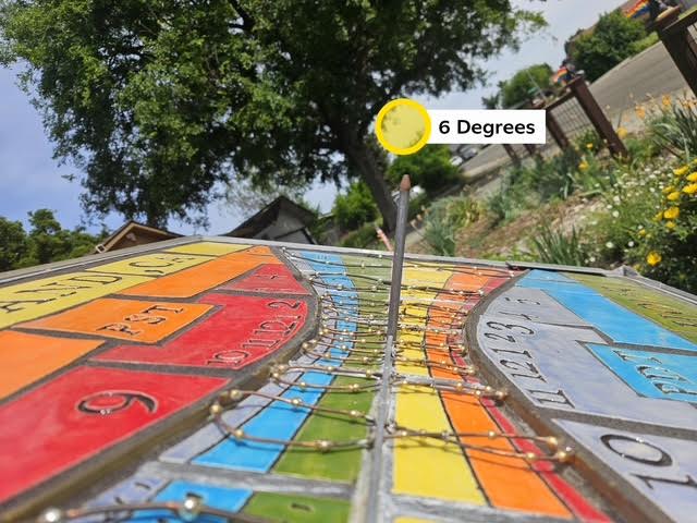 The morning of 3/20/26 arrived with clear skies. As the first sunlight hits the dial at 7:37 AM, it casts a very long shadow. Unfortunately, the shadow is already south of the midline of the east-west Equinox bar; with 8 minutes until the Equinox, the shadow should be exactly on the bar. The sundial would need further adjustment for correct alignment.