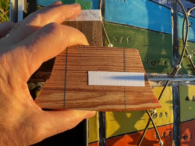 Because of the raised copper analemmas on the face of the dial, the only flat surface for the block was limited to a space between 365 mm to 450 mm west of the gnomon. I scrounged around and found two wooden blocks and guesstimated that a block height of 58.2 mm, reducing the gnomon height to 47.8 mm, would be enough.