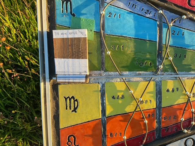 It turns out that the Woodland Polar Sundial needed the Equinox more than the Equinox needed the WPS. Although the accuracy of the projected shadow can be checked at any date or time; and, due to limitations of the dial’s alignment and the perception of the shadow, it makes little practical difference several hours either side of the Equinox, this was a dramatic test of the alignment of the dial.