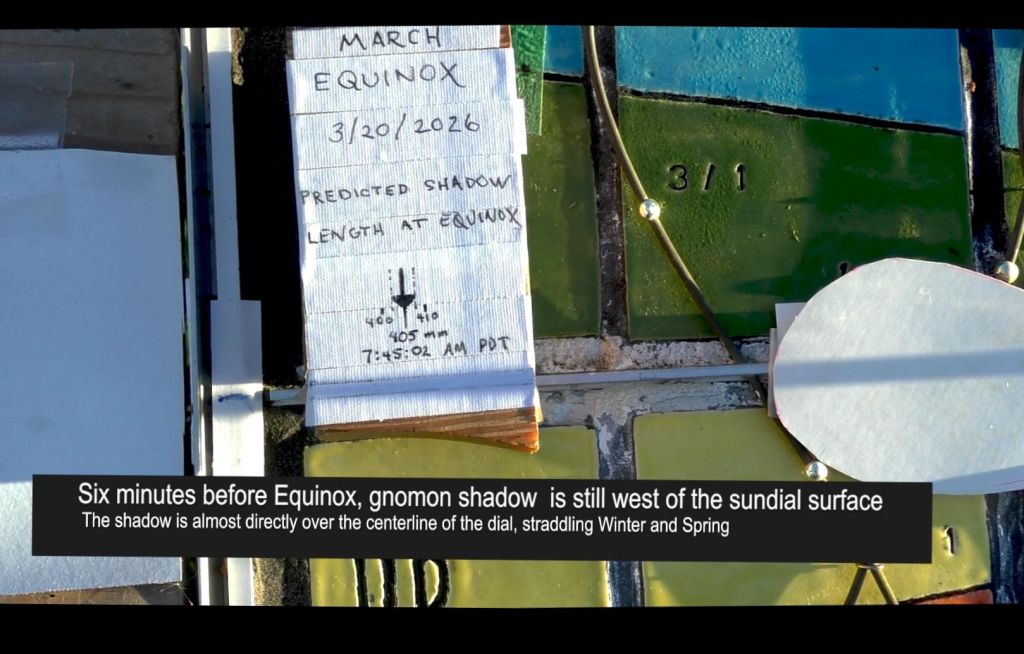 The Equinoxes are always a treat to watch, but in 2026 the March Equinox occurred at 7:45:02 AM PDT, just 35 minutes after sunrise, 7:10 AM. This assured very long shadows at the moment the center of the sun crosses the plane of the celestial equator. A large tree east of the dial mostly blocks eastern light, but there is a gap that allowed direct sunlight from 7:37 AM to 8:10 AM. This seemed providential and I thought it would be a fun challenge to capture the shadow at 7:45 AM. This would be an exercise in low-altitude precision sundialing, where rapidly changing shadows and the geometrical optics effects which cause the penumbral shadow have to be considered.