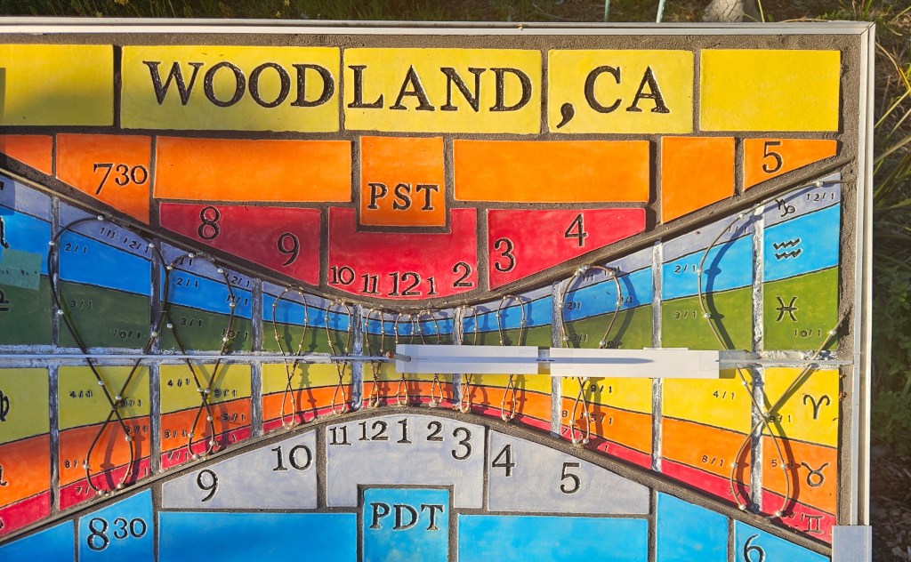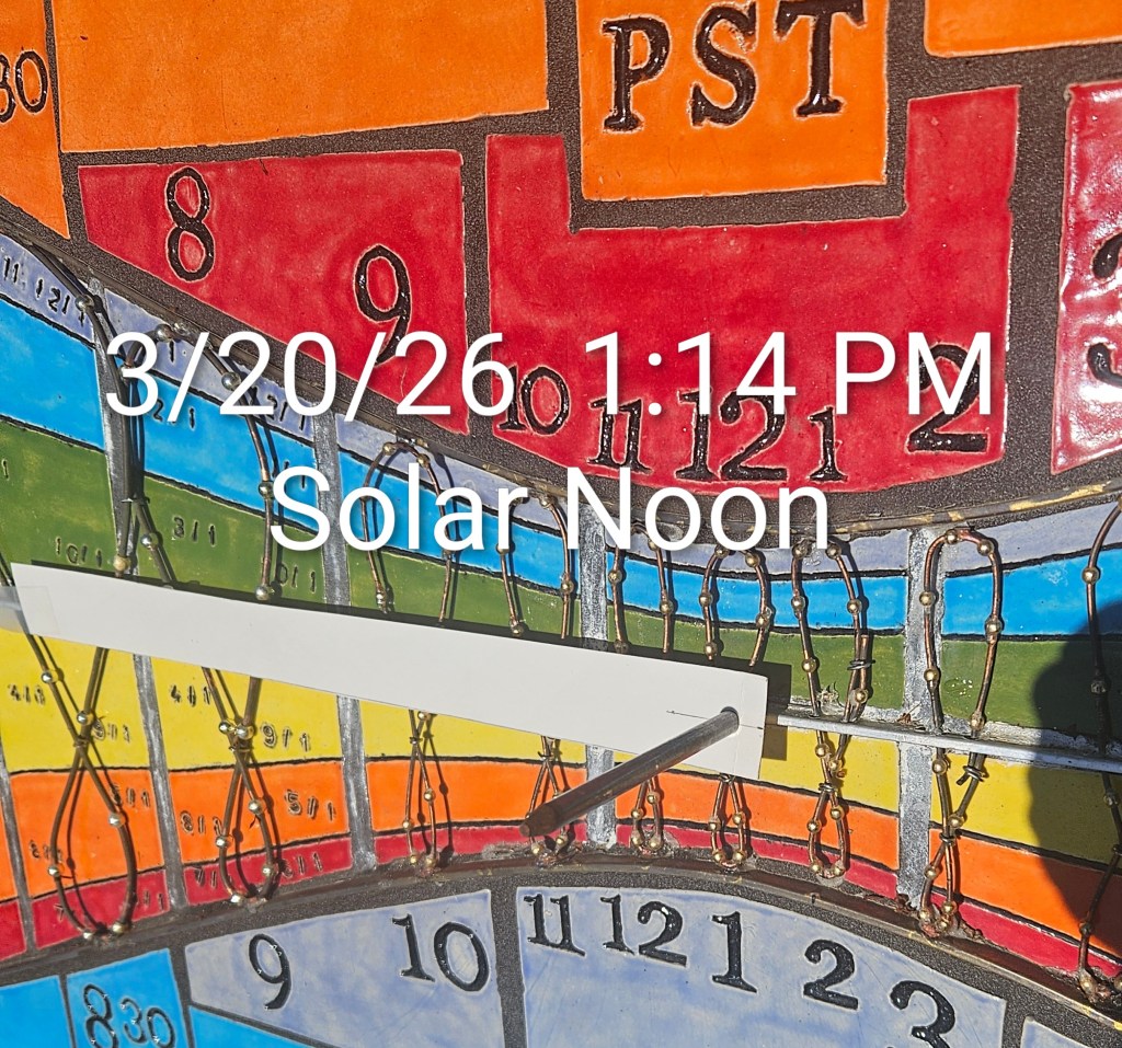 The March 2026 Equinox was met with tremendous anticipation at the home of the Woodland Polar Sundial. The Equinox is the great equalizer for our planet, since sunrise occurs almost due east and sunset almost due west, and the shadow of the tip of any perpendicular pole will track along a straight line throughout the day on any point on Earth, except the poles. A polar sundial does all this, but the shadow of the gnomon also tracks a line due west to due east that bisects the dial face , showing the beautiful symmetry and cycle of our annual trip around the sun.