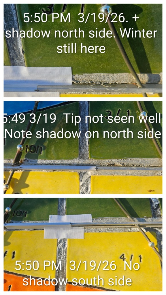 There is a small tree to the west so the last sunlight the dial received was about 5:50 PM on 3/19/26, the day before the Equinox. The shadow is very close to the midline east-west Equinox bar, but is clearly on the northern side; the sun is still in the southern sky. It is still winter.