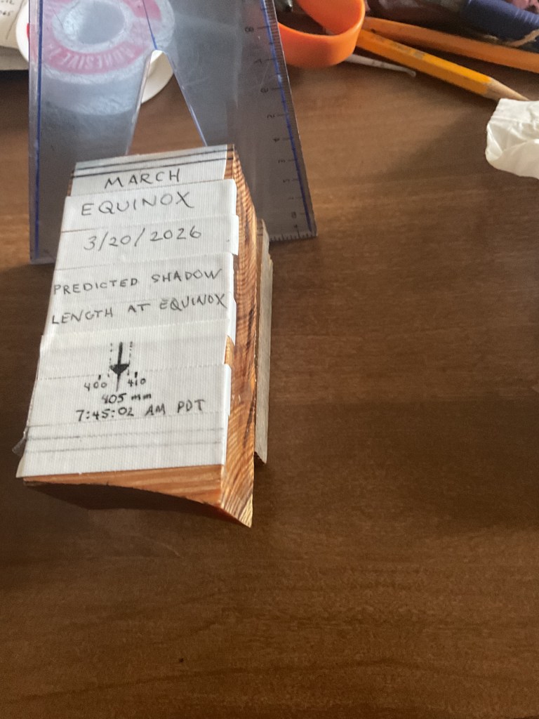 Starting on 3/8/26, I calculated the “effective equatorial altitude” as above and determined the predicted shadow length for a 47.8 mm gnomon until 3/22/26; this is the red line on the graph below. The altitude decreased from 11.32° on 3/8/26 to 7.72° on 3/20/26 ( I used Suncal.org to determine these which is why there is discrepancy from above 7.65° value). Each day from 3/8/26 to 3/19/26 ( all incredibly cloudless horizons), at 35 minutes after sunrise, I measured the observed shadow on top of the block . This is the black line. At these extremely low altitudes, slight time/altitude changes , not to mention small misalignments of the dial’s correct position, resulting in in large shadow changes, so , not surprisingly, there was more deviation from predicted as altitude decreased. On 3/19/26, I extended the observed shadow length line onto 3/20/26, to arrive at a predicted shadow length of 405 ∓ 2.5 mm. I then marked out where the block would go on the dial face so the 405 mm arrow would be 405 mm from the gnomon.